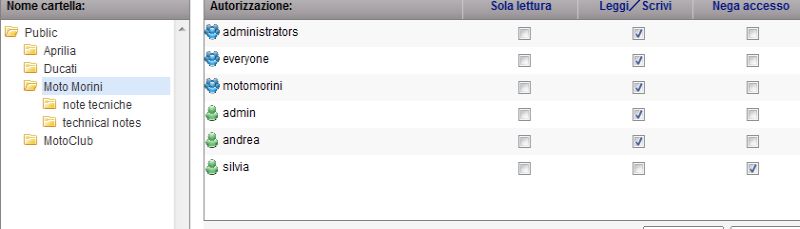 Io voglio che il gruppo "motomorini" possa leggere/scrivere nella cartella Moto Morini ma NON possa scrivere nella cartella Public.