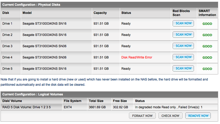 Ovviamente allarmato della cosa mi metto a cercare le possibili cause, dopo varie prove l' indiziato principale è l' alimentatore, viene prontamente sostituito con un modello da PC con potenza superiore 600w contro l' originale da 250w lasciandolo all' esterno per ovvie ragioni si spazio. Riaccendo il tutto con mio grande disappunto scopro che questi spegnimenti inadeguati hanno mandato un HD fuori uso e degradato il RAID 5 in modalità solo lettura con l' impossibilità di ricostruire il RAID, in questa situazione (come riporta il manuale) è praticamente impossibile recuperare il RAID ma è possibile copiare tutti i file e successivamente ripristinare da 0 il NAS.