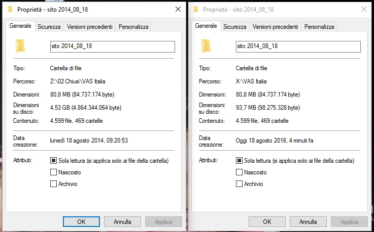 Anche io sono ignorante in ambiente linux/unix, ma qualcuno mi spiega perchè le "dimensioni su disco" sono così diverse. Sto migrando i file da un turbo NAS TS209 PRO II con due dischi da 500 Gb a un TS210 con 2 dischi da 2 Tb... la stessa cartella che ha dimensioni paria a 80,8 MB sul TS209 la "dimensione su disco" risulta di 4,53 GB, mentre sul nuovo TS210 risulta di 93,7 GB... c'è qualcosa che mi sfugge