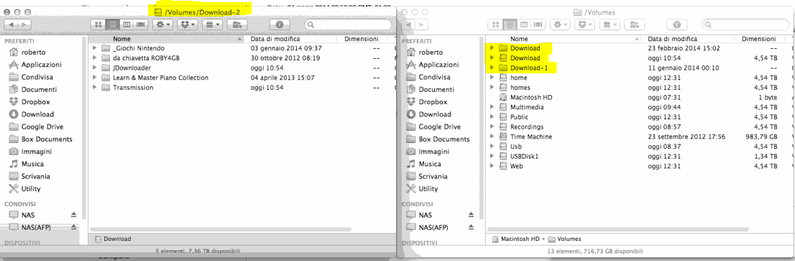 Funziona tutto ma stranamente la cartella "Download" (vedi allegato) viene montata come /Volumes/Download-2 nel Finder (immagine di sinistra nell'allegato) e nel percorso /Volumes folder (immgine di desta nell'allegato) trovo 3 cartelle Download: