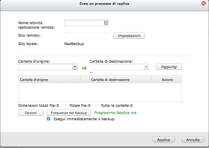 Ho creato le cartelle di backup sul secondo disco, ho abilitato il server Rsync dal menù del Backup sul NAS, poi ho impostato la replica remota delle cartelle da salvare.