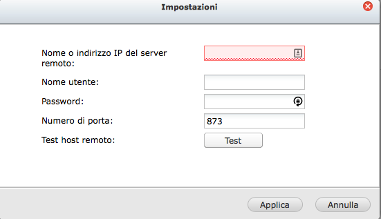 Sulla voce "sito remoto" dovrai inserire semplicemente l'indirizzo IP del tuo NAS, alla voce "nome utente" metterai il tuo attuale nome utente e -ovviamente- alla voce "password" dovrai inserire la tua password.